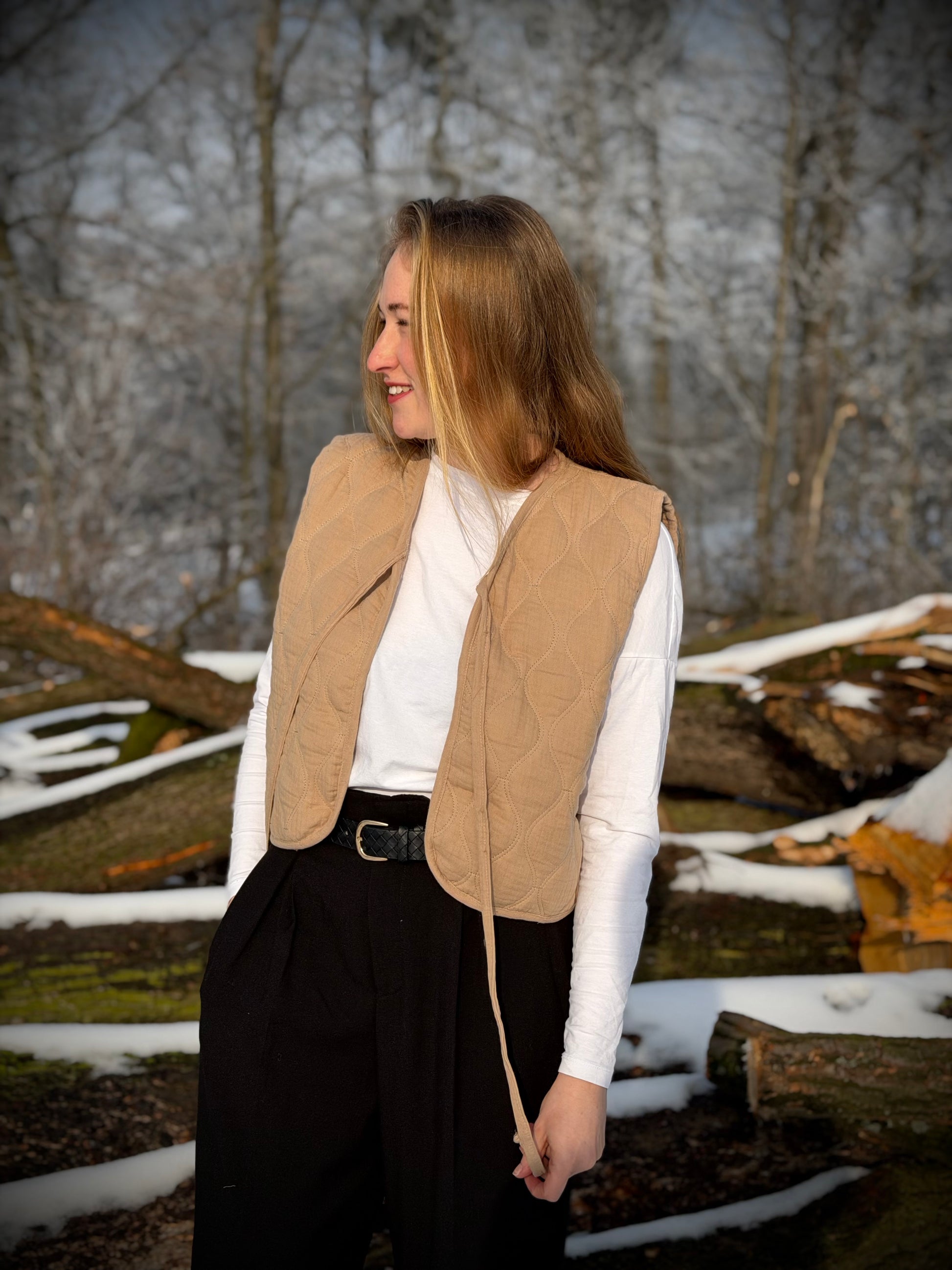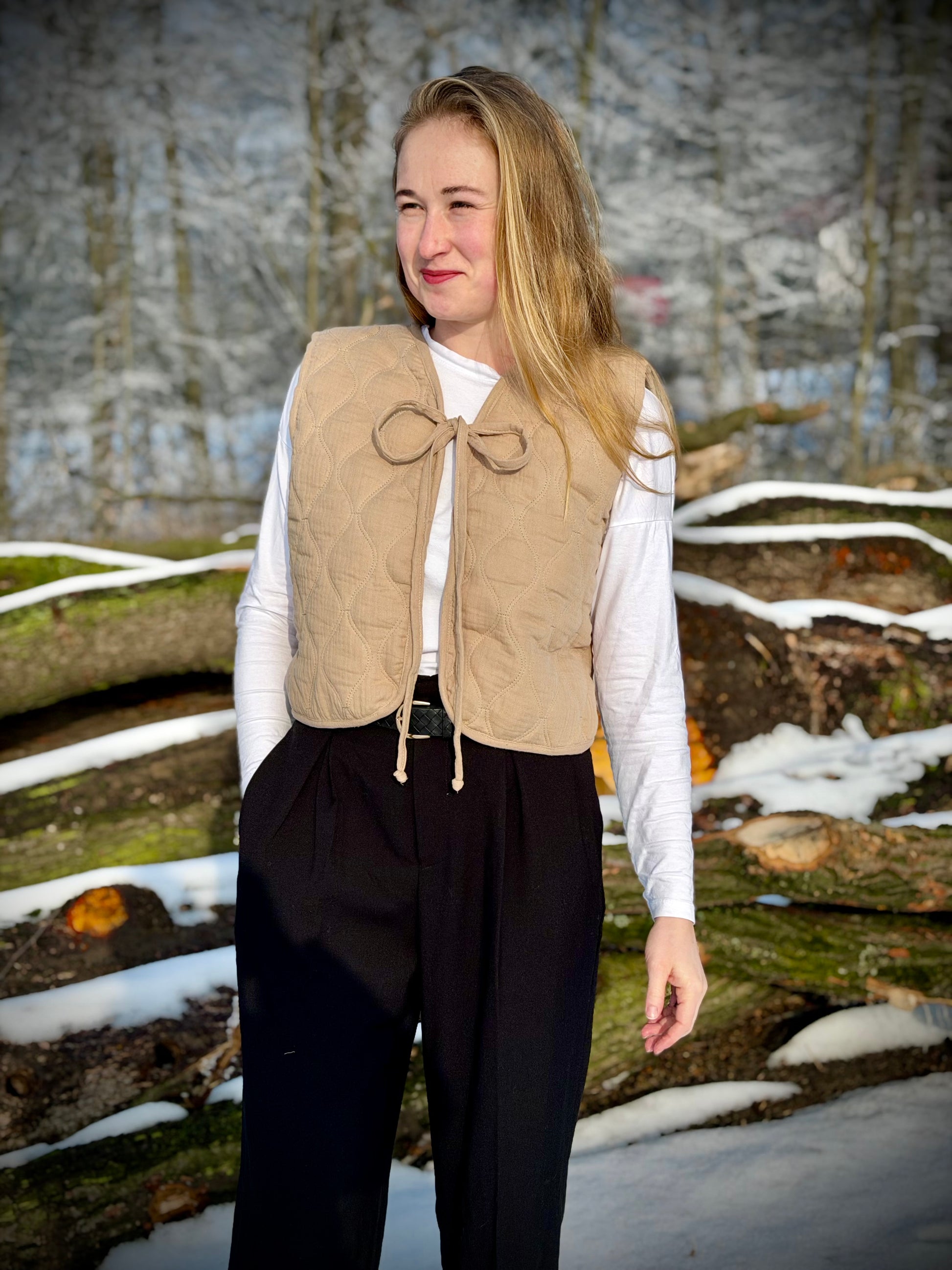 Tuto vestičku jsem navrhla pro období, kdy je už/ještě čas na šaty, ale dát si přes ně svetr nebo bundu by bylo moc hřejivé. Vestička je přesně tou vrstvou, kterou hledáte, když není úplná zima, ale “něco by to chtělo”. No a také jsem při sestavování střihu myslela na to, aby se vlezla na svetr nebo mikinu, když začne být opravdu chladno. Vestičku schováte i pod kabát. Takže se jedná o celoroční kousek <3